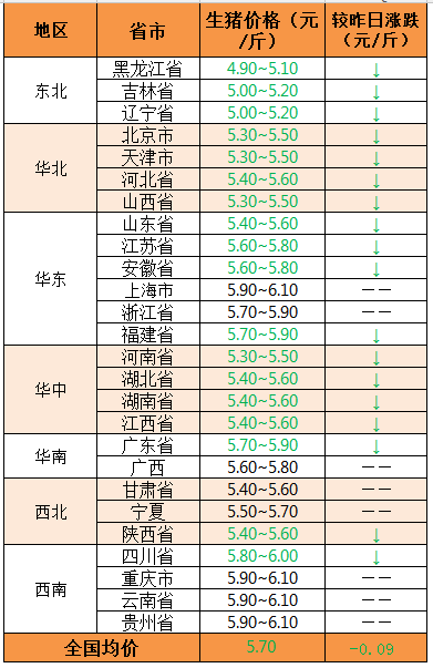 华南稳中有降:广东生猪市场价格降0.1元/斤,规模场价格在5.7-5.9元/斤;广西生猪价格稳定,规模场外三元出栏价5.6-5.7元/斤;