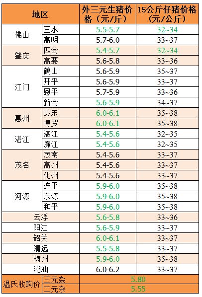 【养猪信息网今日猪评】:3月13日,广东外三元收购价稳中有降。温氏广东区接货价下调,三元杂接货价为5.8元/斤,二元杂接货价为5.55元/斤 。